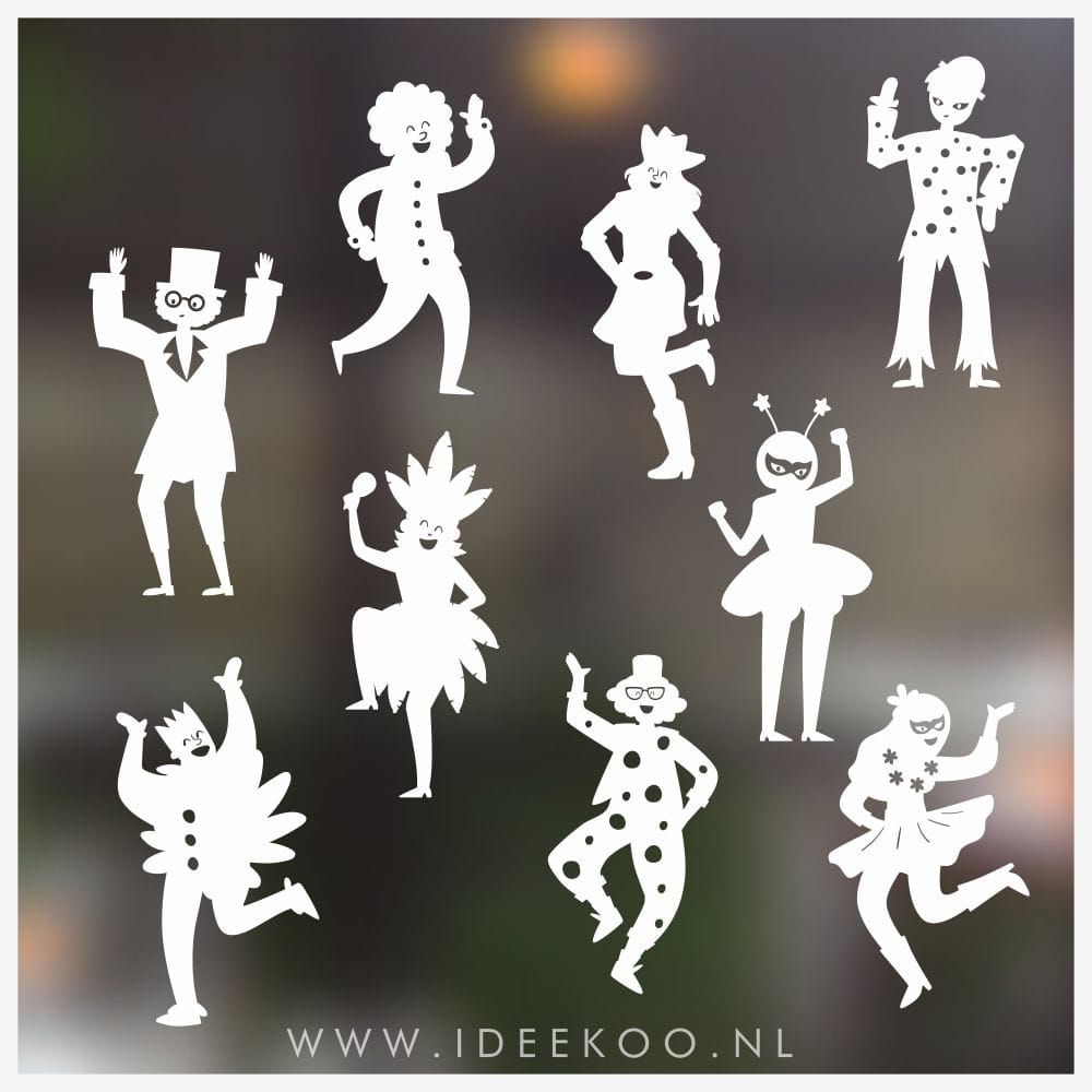Herbruikbare raamsticker Carnaval sticker Raamsticker Groep Carnavalsvierders 9 stuks, gemaakt van statisch vinyl.